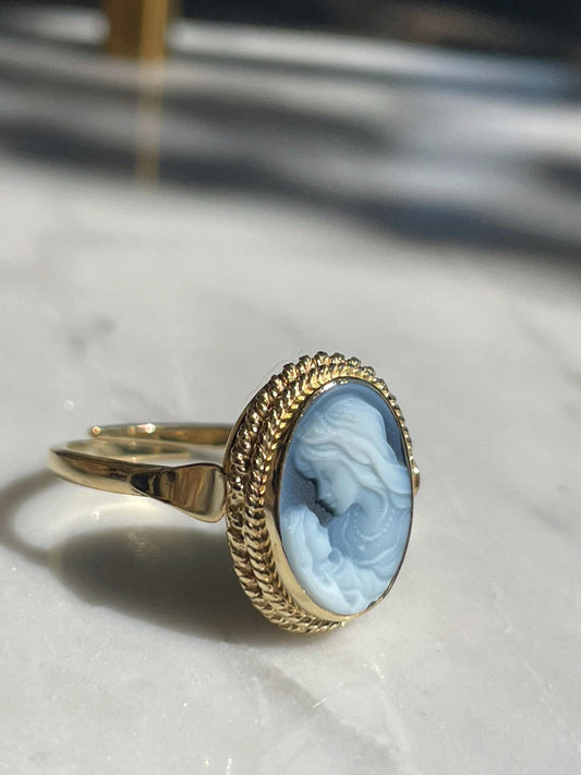 Blue cameo adjustable ring, 18K gold silver sterling, gift for her, made in Italy, waterproof ring, victorian style, gold cameo ring, mother