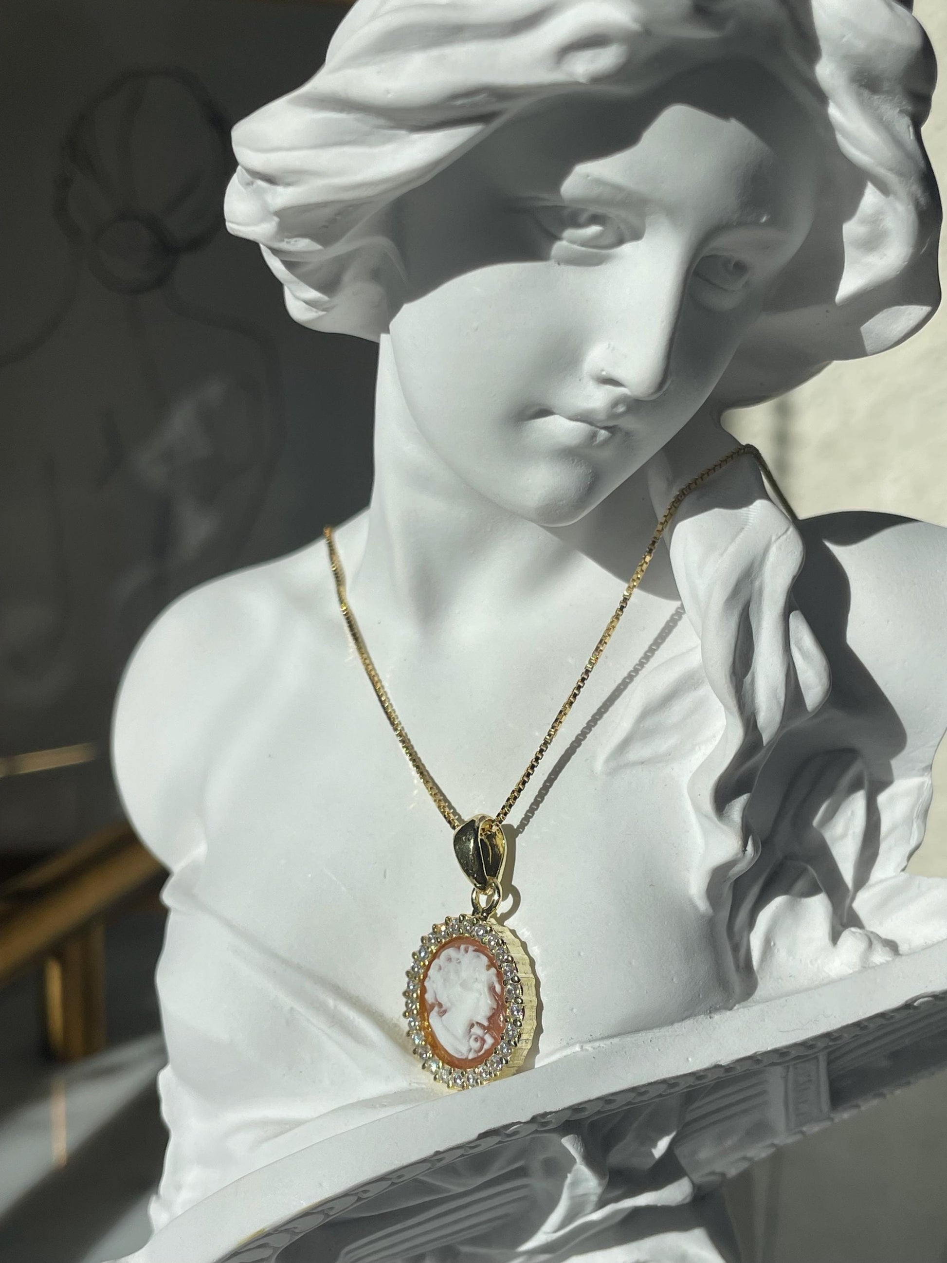 -Joanne Necklace- handmade cameo necklace carved from sea shell; carved by hand. Framed with a beautiful 18kt golden silver sterling and shiny zirconia.