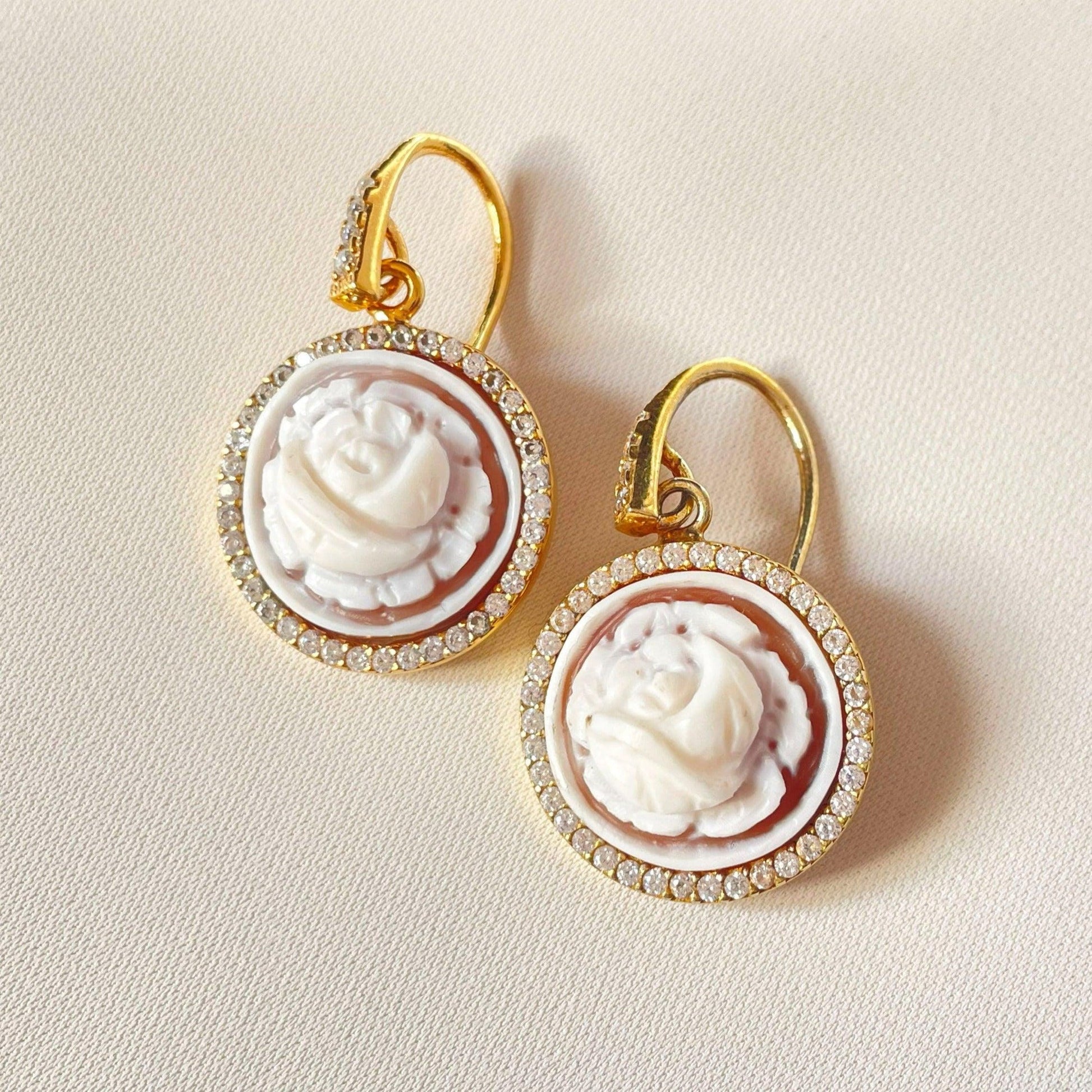 18K gold drop earrings, Cameo earrings, drop earrings, glam earrings, wedding, bridal jewelry, made in Italy, custom gift for her, floral