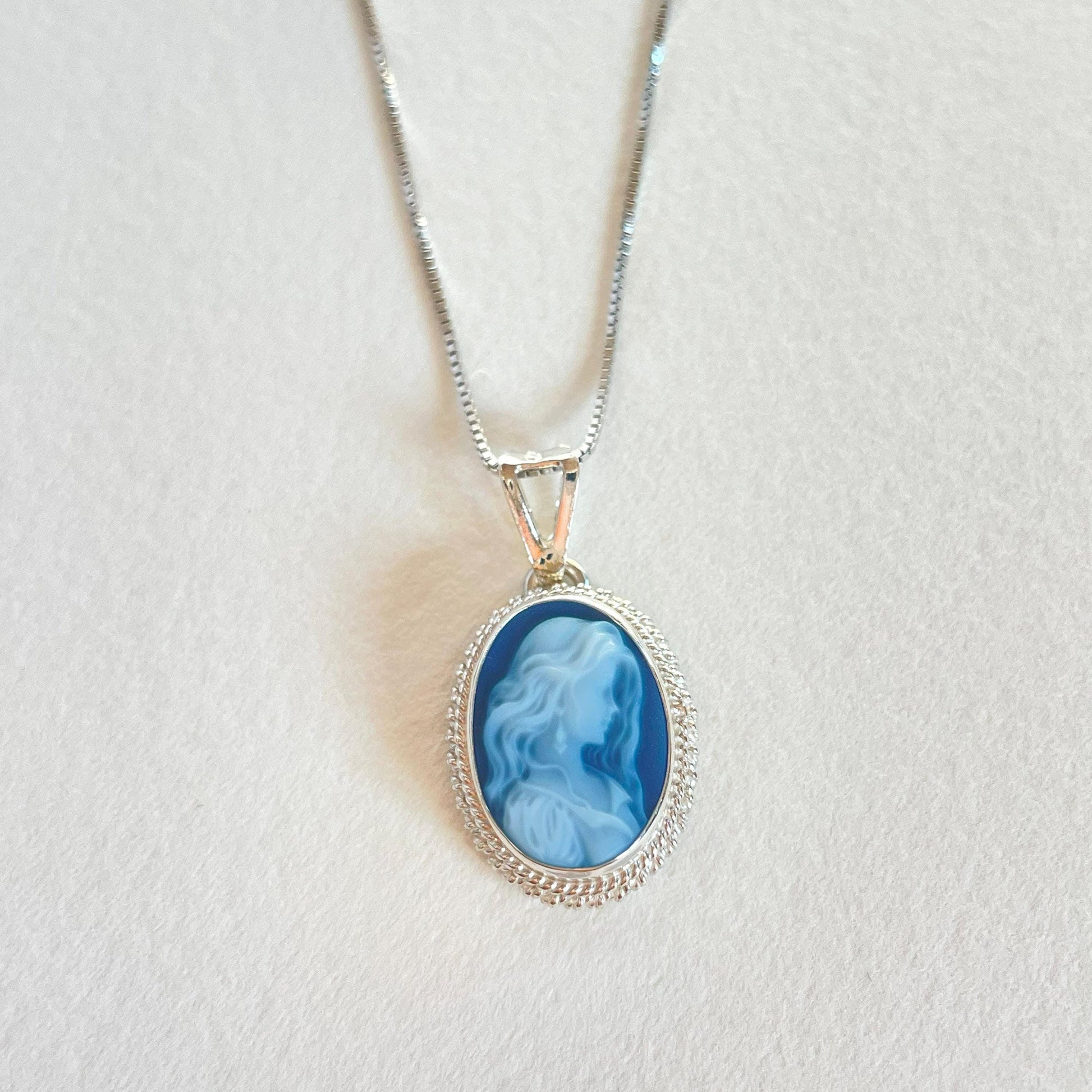 Featuring a blue agate cameo necklace framed with a silver sterling 925 textured frame and chain.
