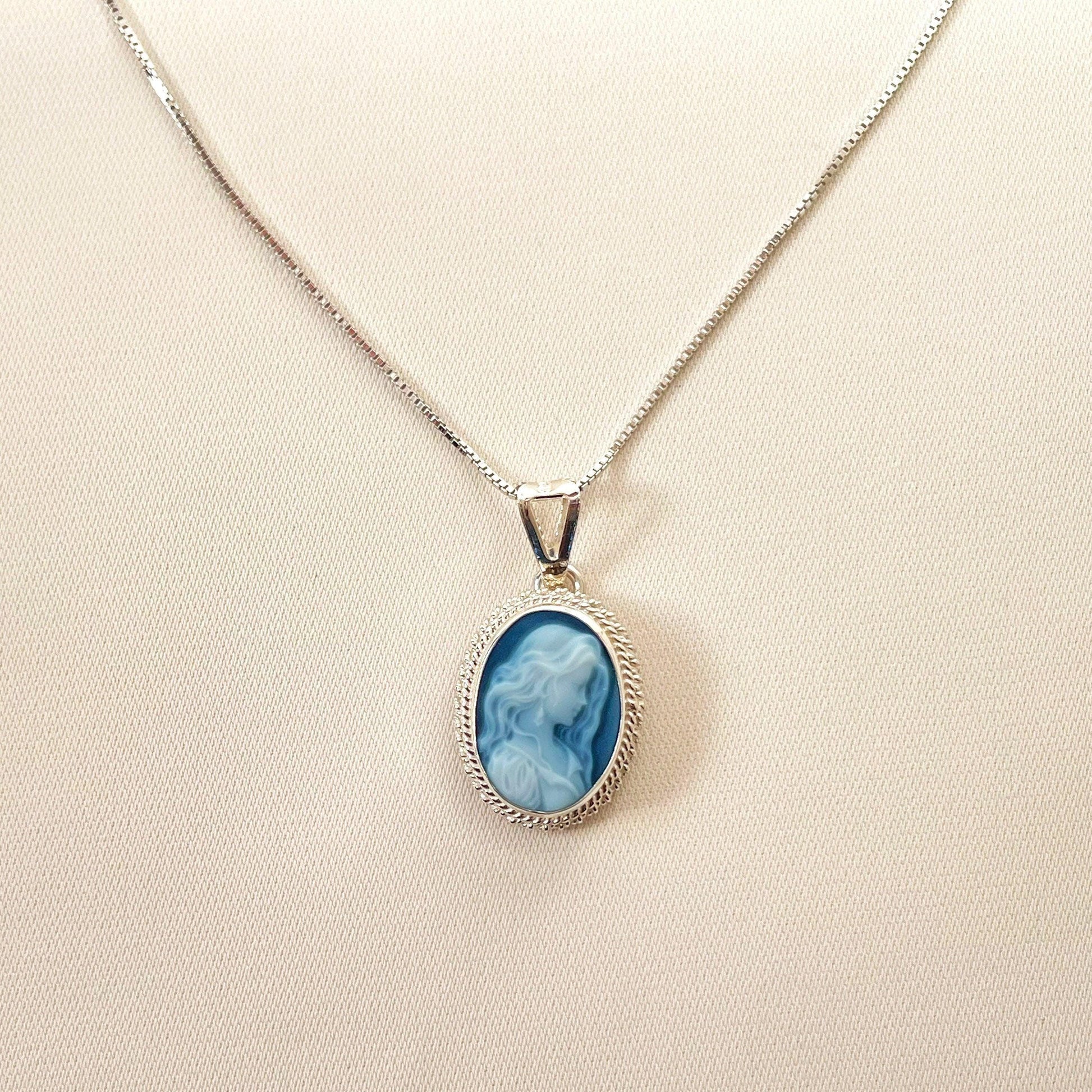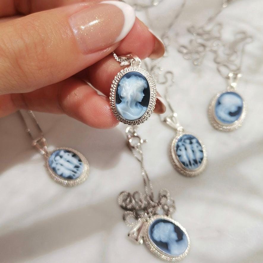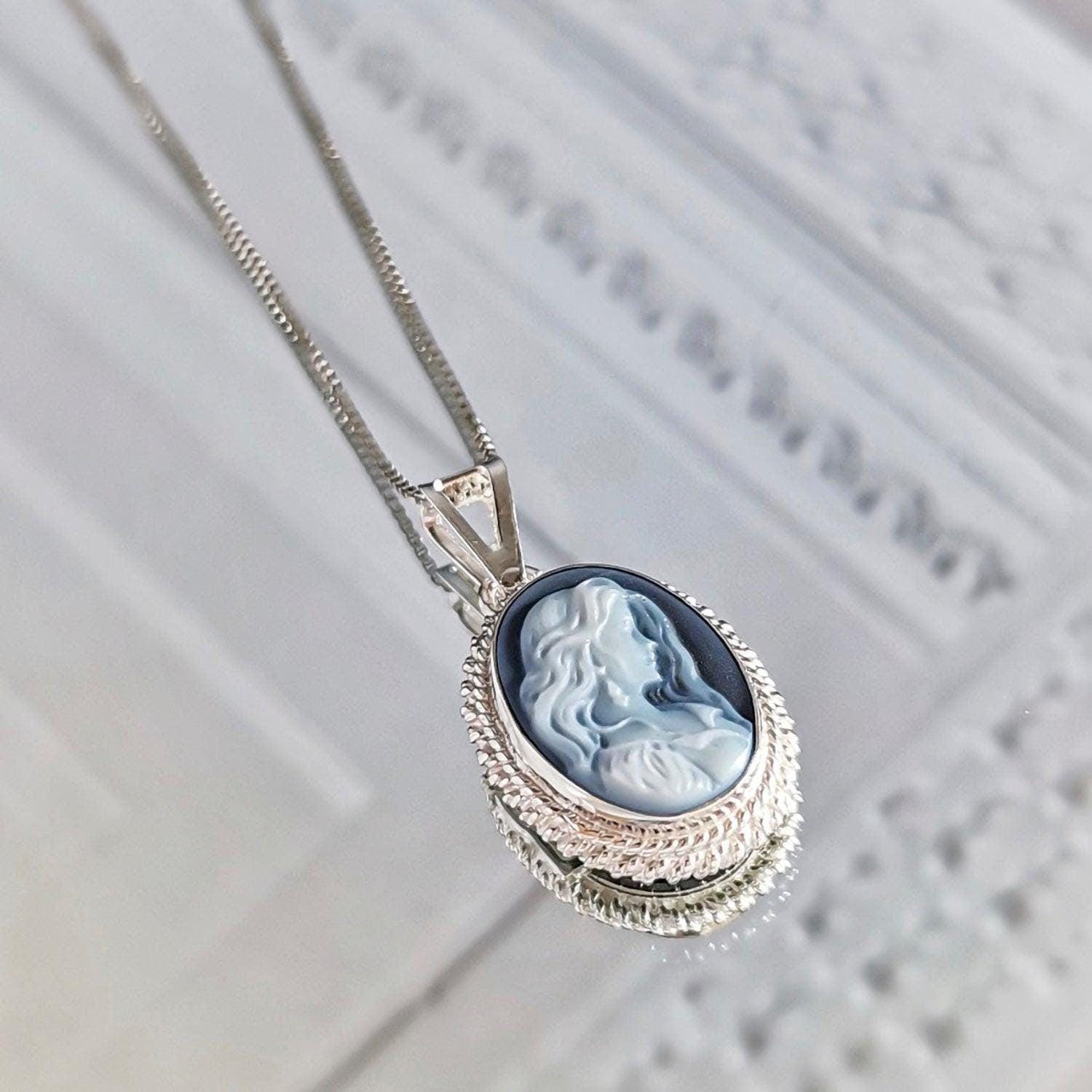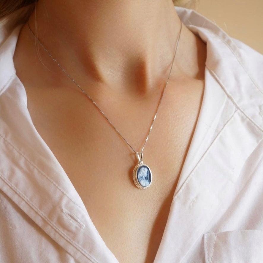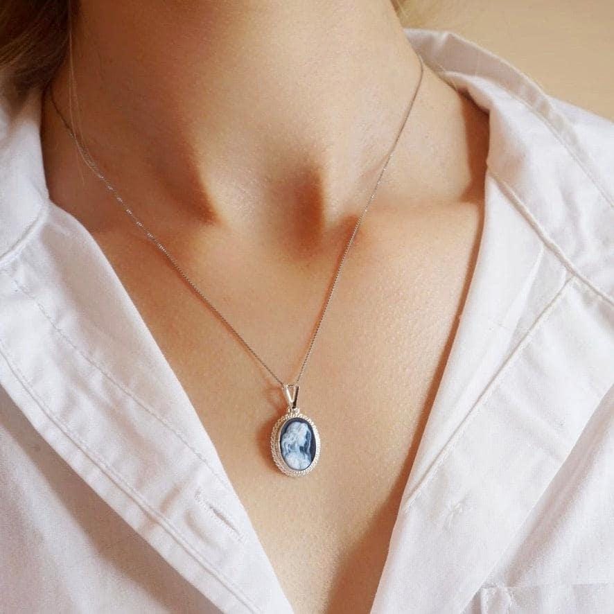 Blue cameo necklace, silver sterling 925, made in Italy, personalised gift for her, blu agate, victorian vintage, gifts under 100, fall gift