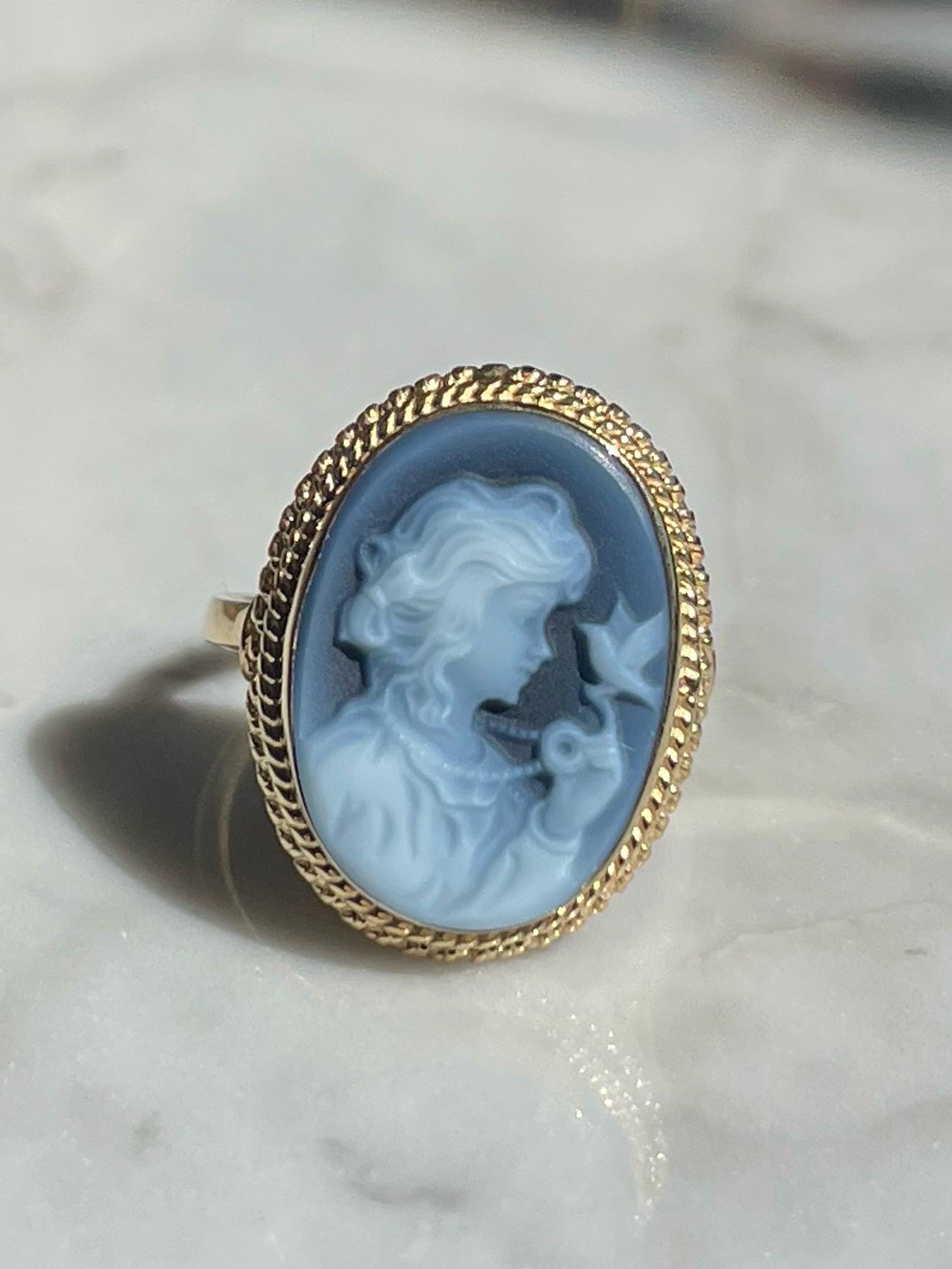 Blue cameo adjustable ring, 18k gold plated, silver sterling 925