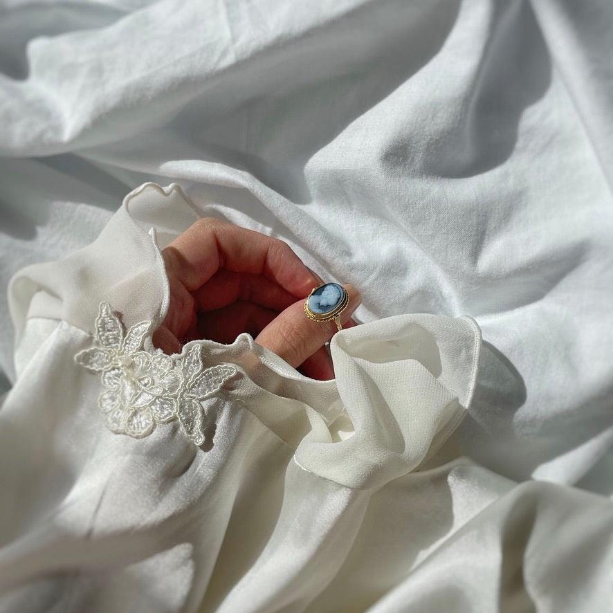A piece that is both elegant and timeless featuring a deep blue agate cameo, framed in textured 18k gold plated sterling silver (925). The adjustable band fits any adult size comfortably and is completely irritation and allergy free.