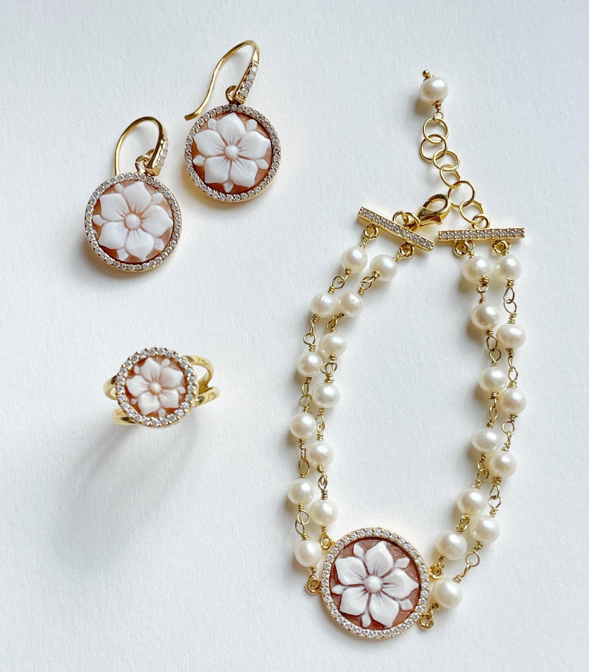 bridal set, cameo jewelry, 3 pieces floral jewelry set, bracelet, earrings, ring, anniversary gift, bridal jewelry, handmade cameo set, mom