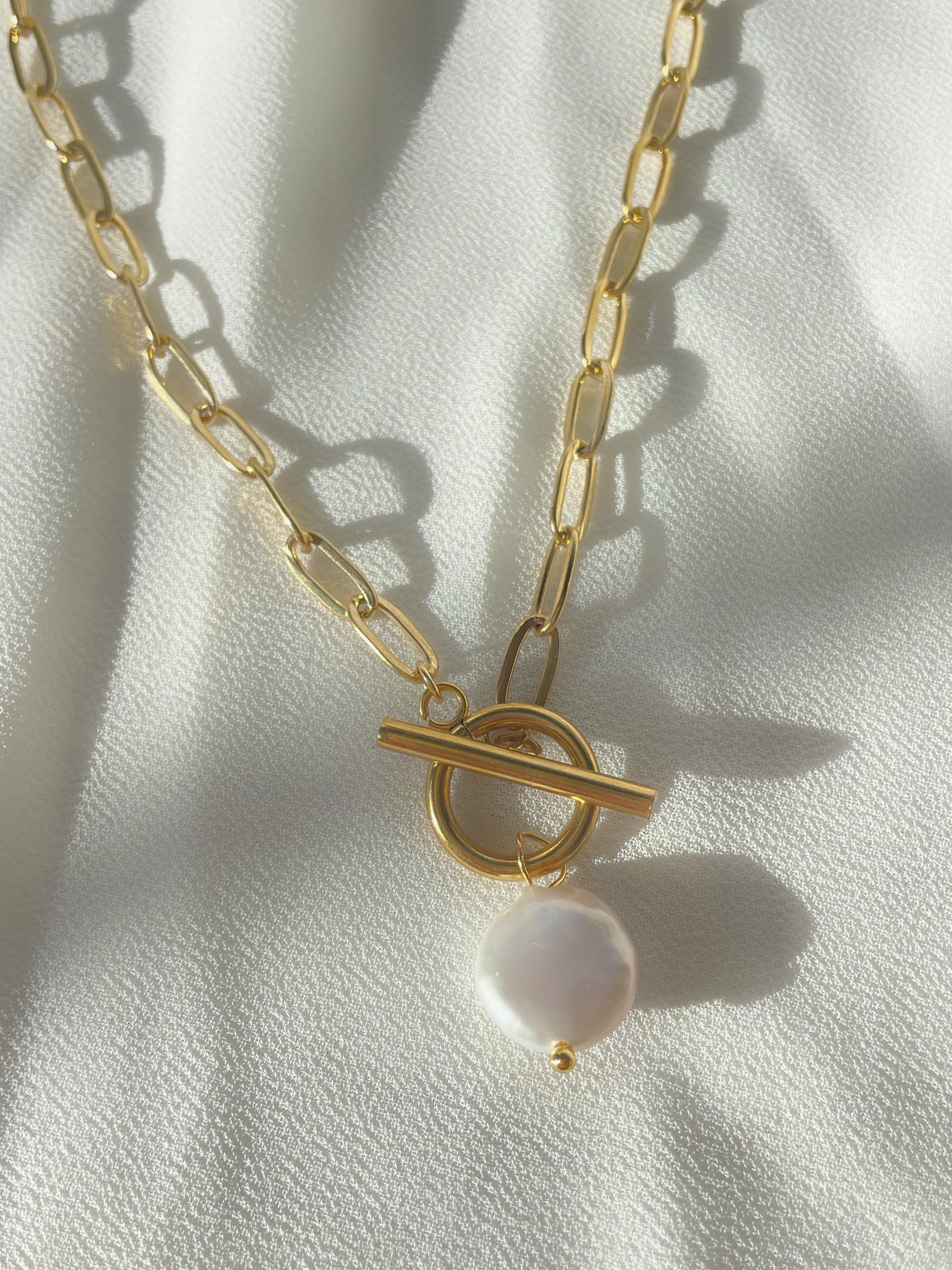 cable link chain necklace, pearl pendant, 18k gold necklace, waterproof golden necklace, link chain necklace, toggle clasp link chain, mom