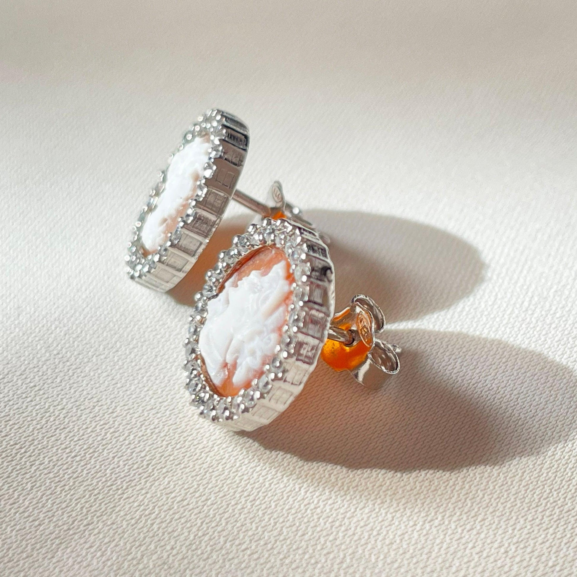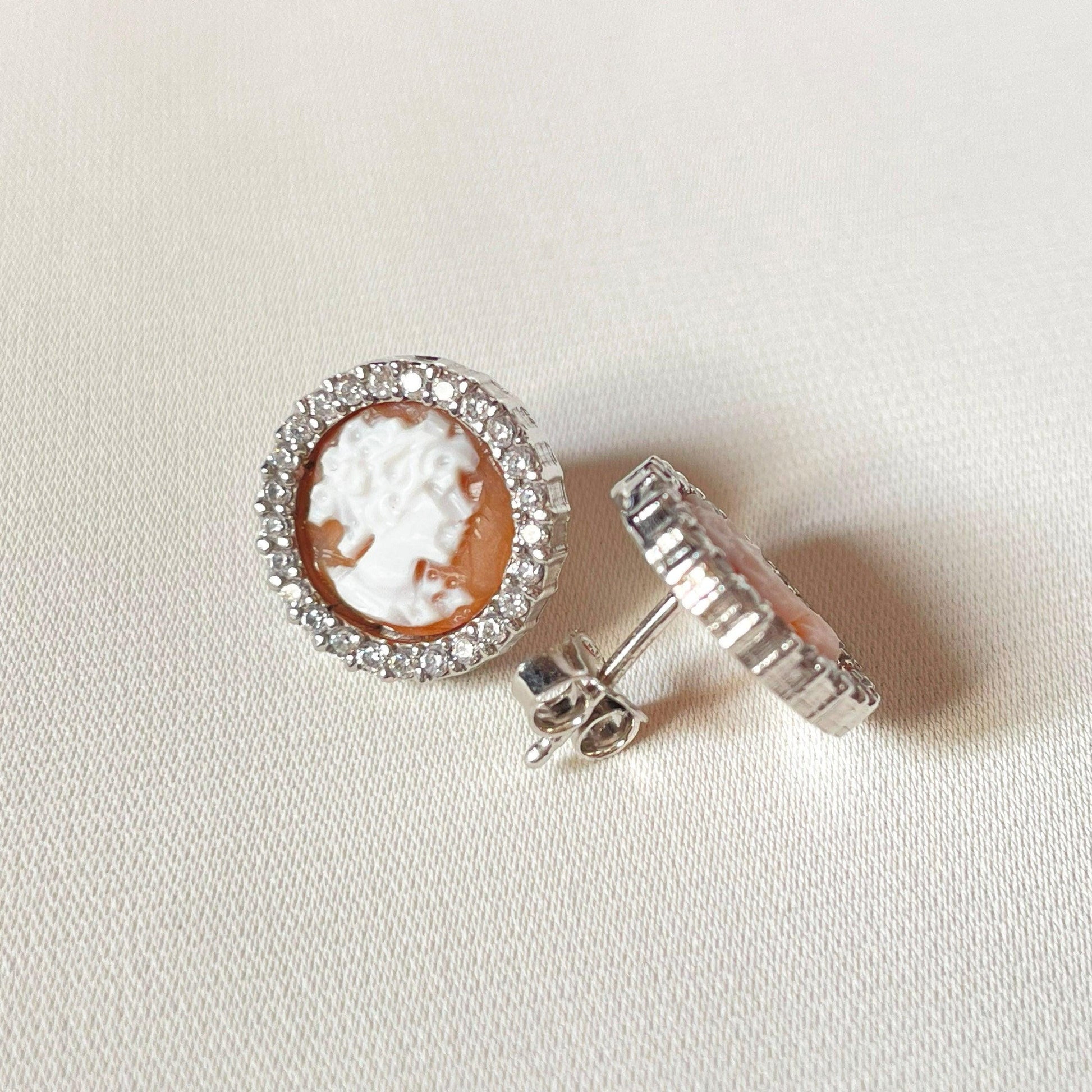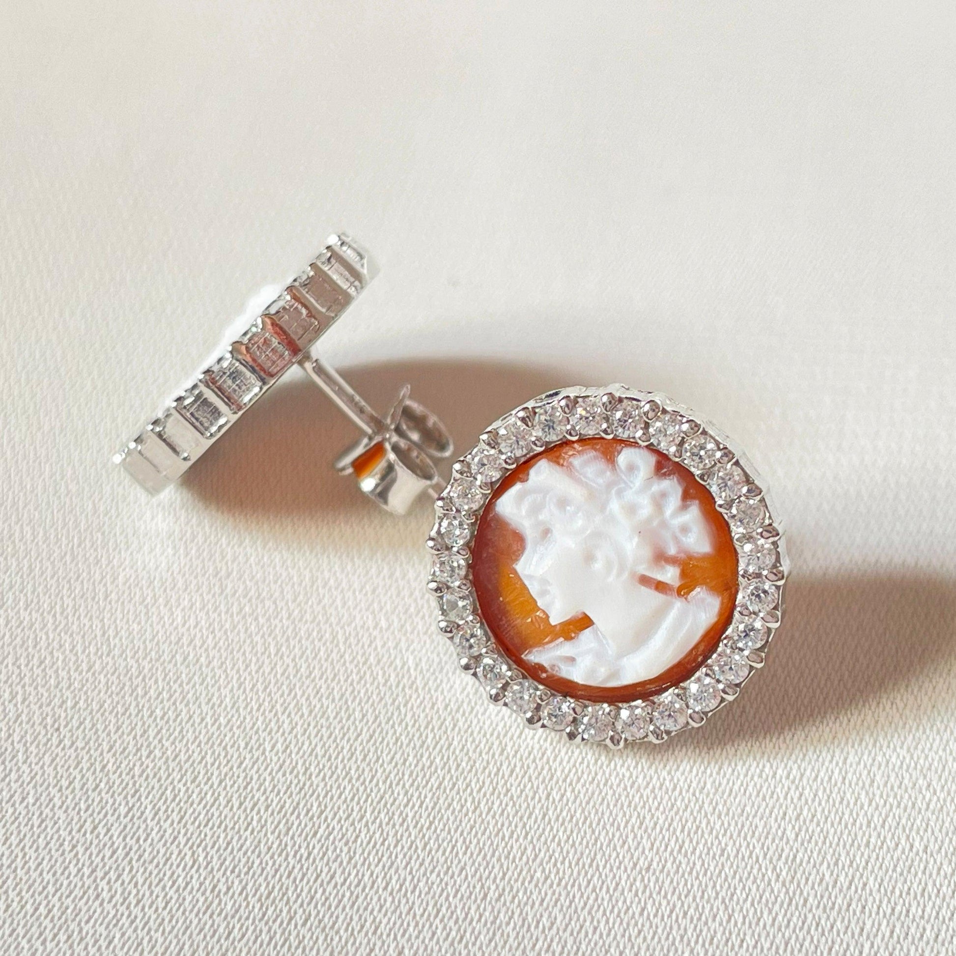 cameo is a classic design carved by hand from sea shell, framed by silver and zircons. gold pair available in our shop!