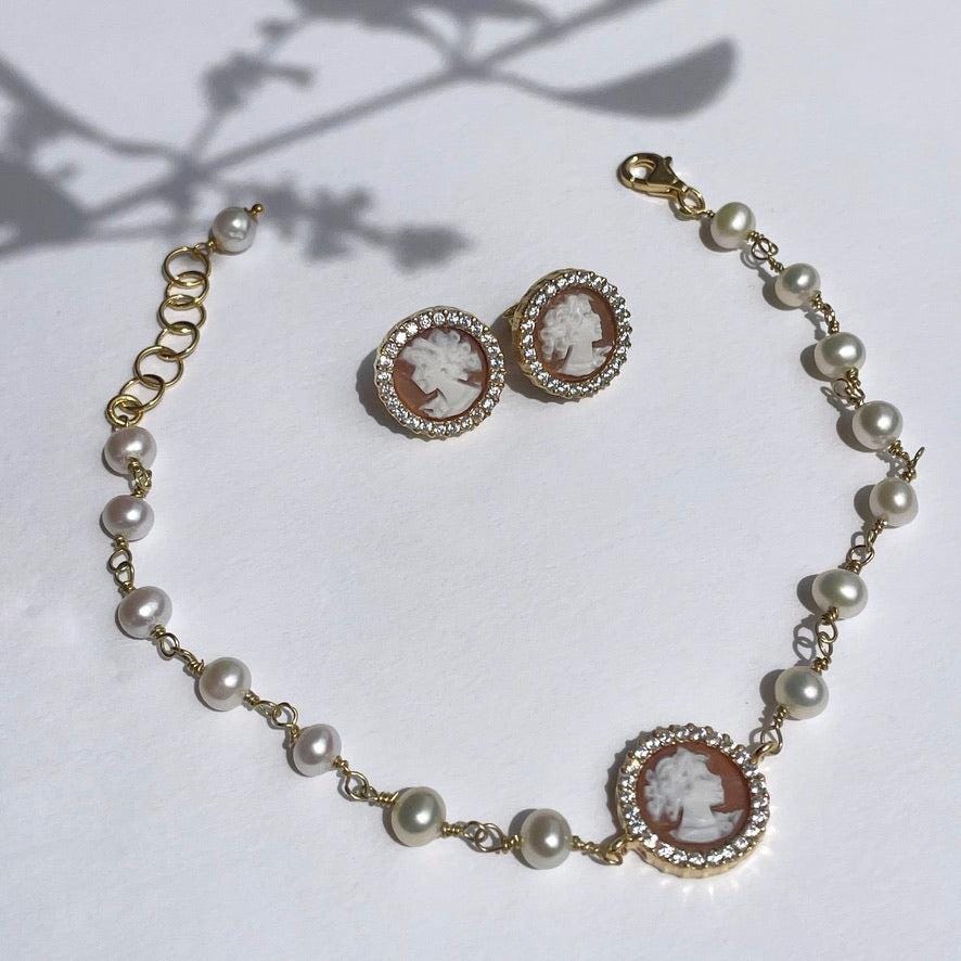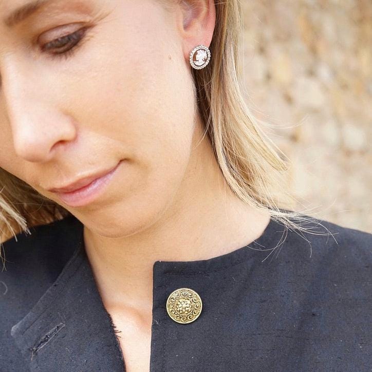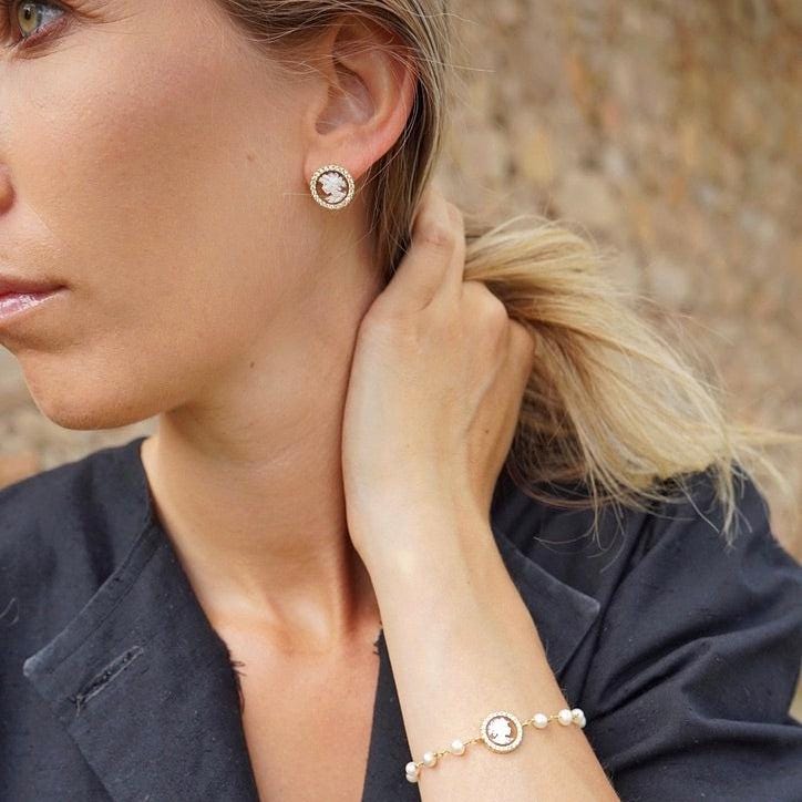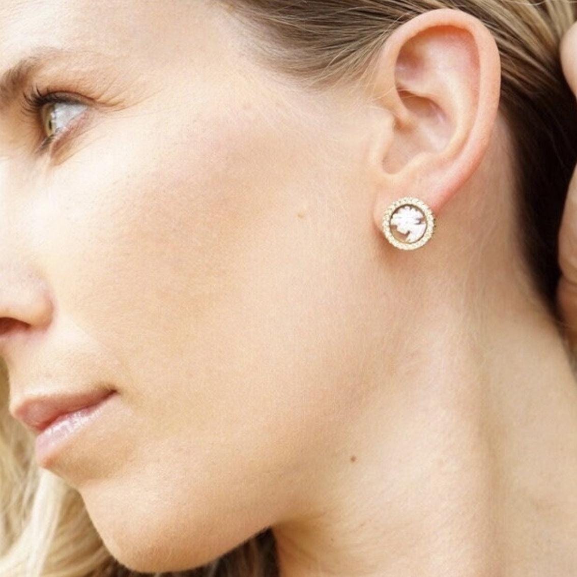 cameo is a classic design carved by hand from sea shell, framed by silver and zircons. gold pair available in our shop!