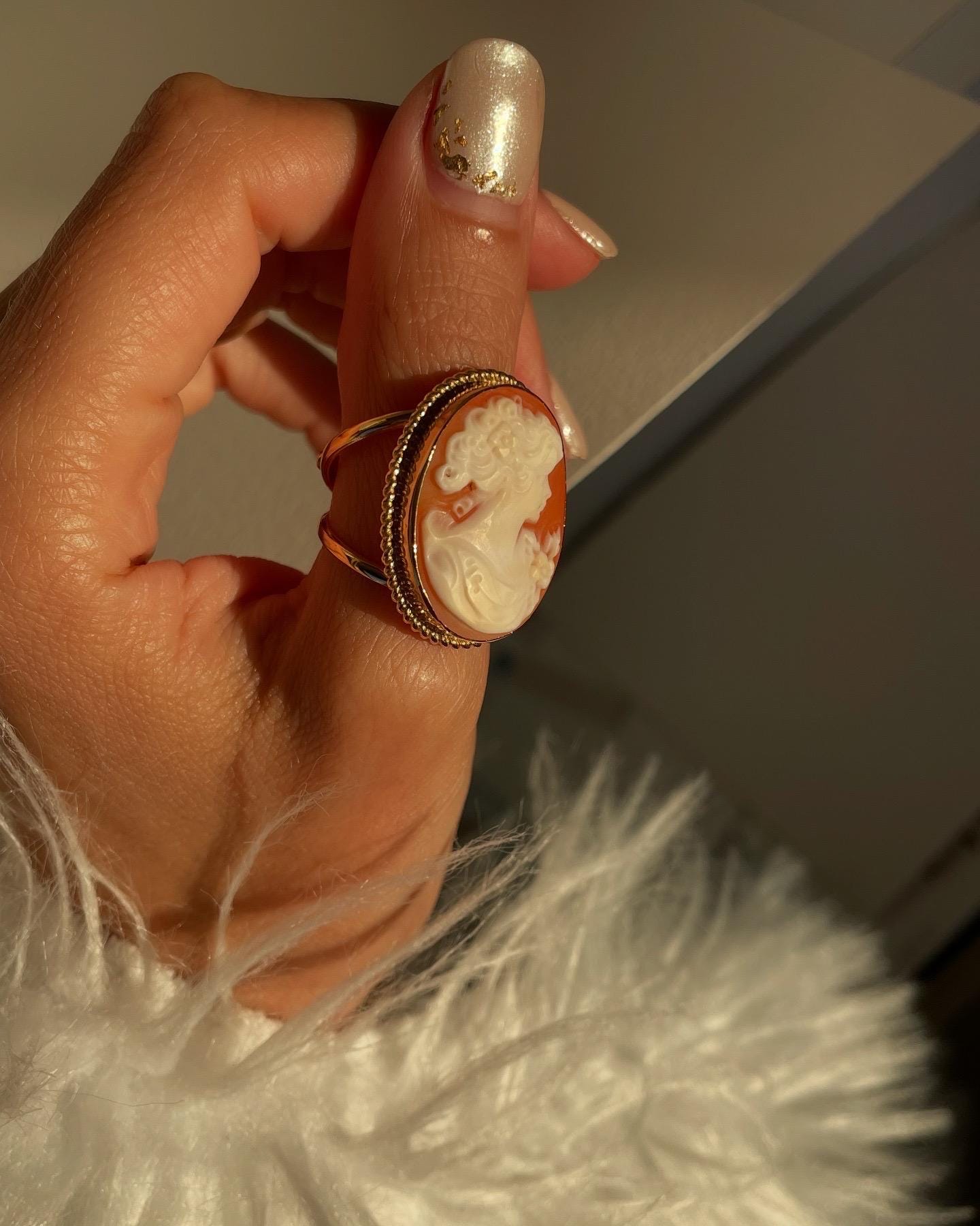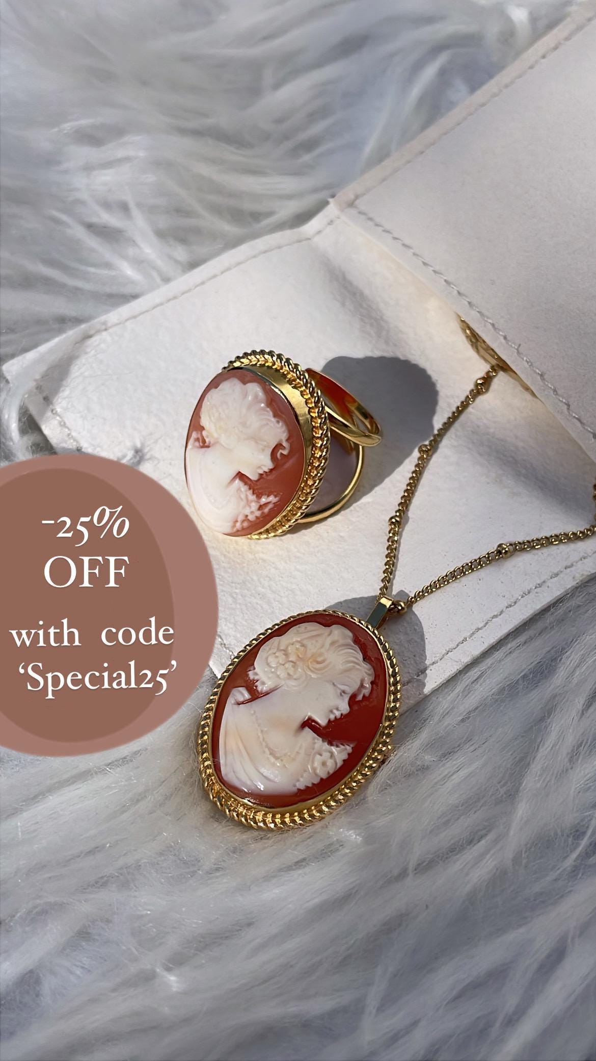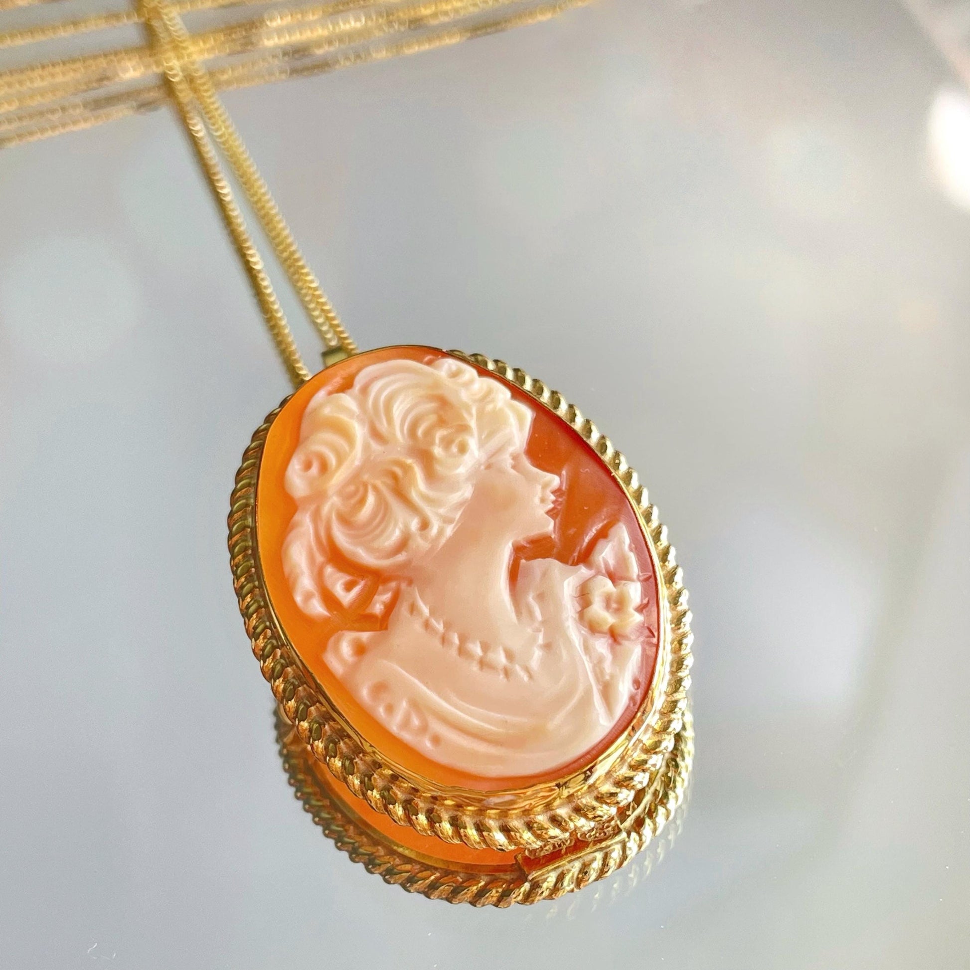 Featuring a handmade cameo brooch necklace and ring carved from a pink sea shell; framed with a beautiful textured golden silver sterling frame and chain.
