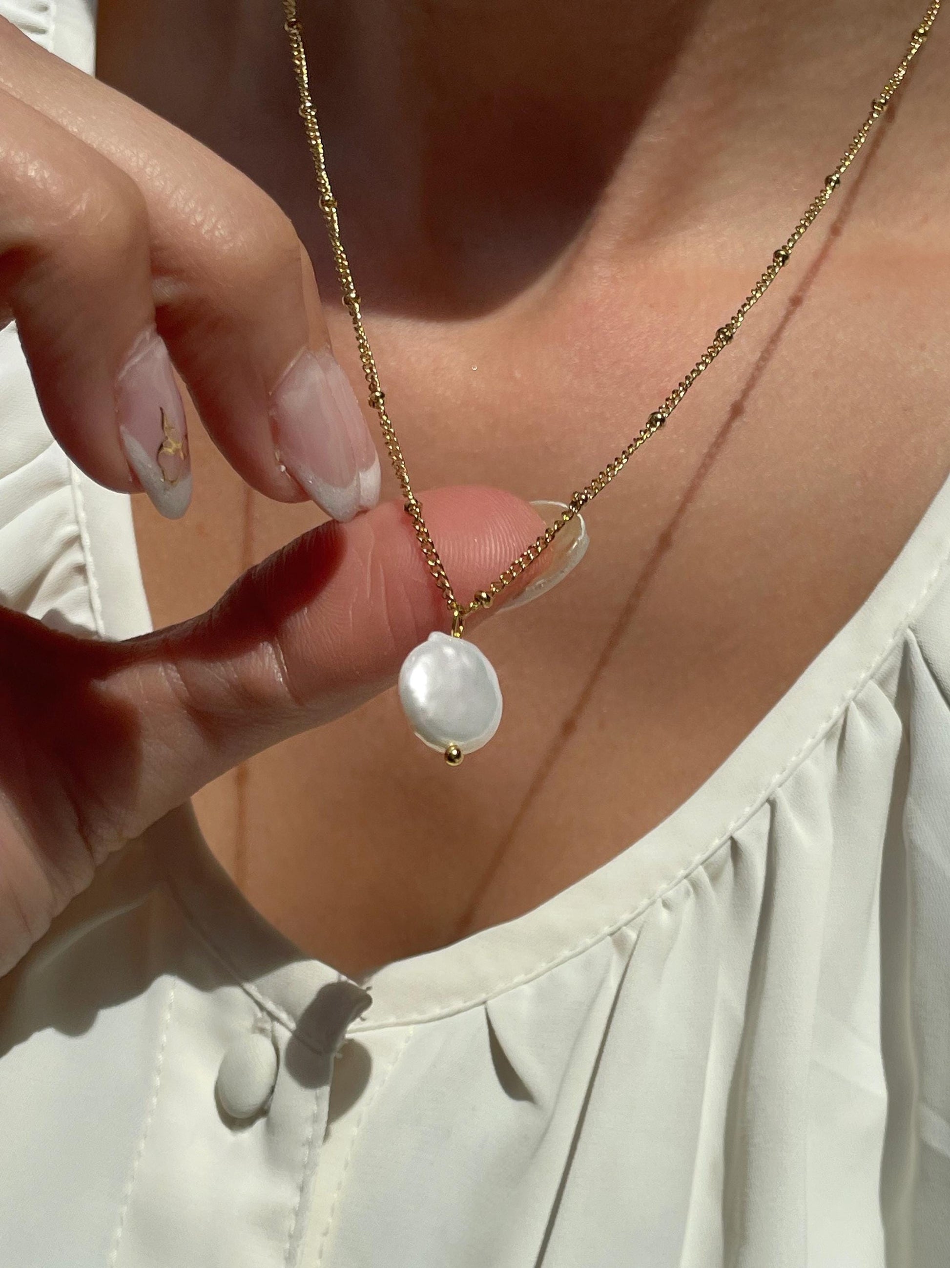 Featuring a lustrous freshwater pearl pendant delicately suspended from a charming 18k golden chain. The irregular and natural shape of the pearl adds to its charm & timeless sophistication, while the warm gold finish adds a touch of luxury. Perfect for both everyday wear and special occasions, this piece brings a refined, graceful touch to any ensemble!