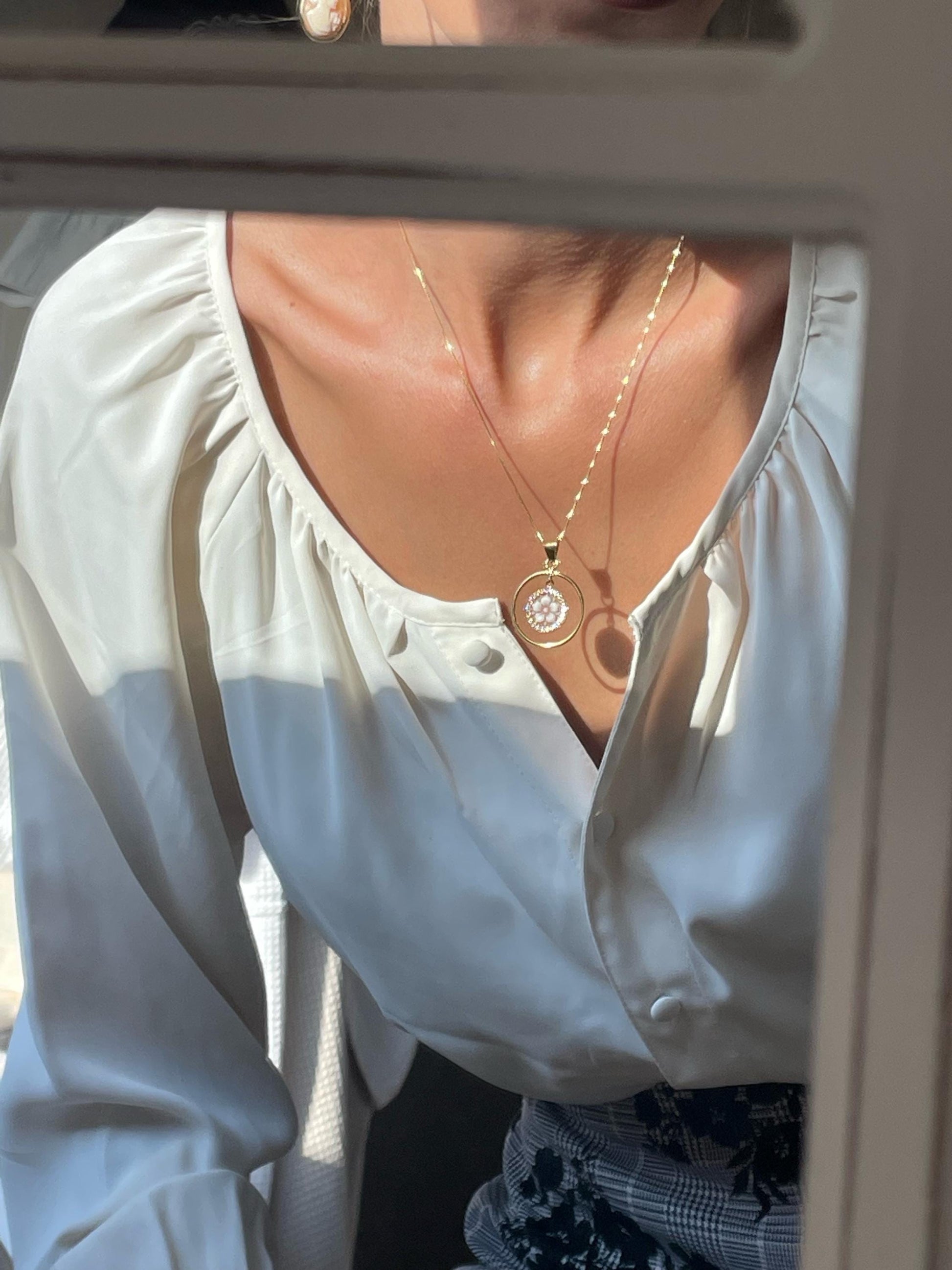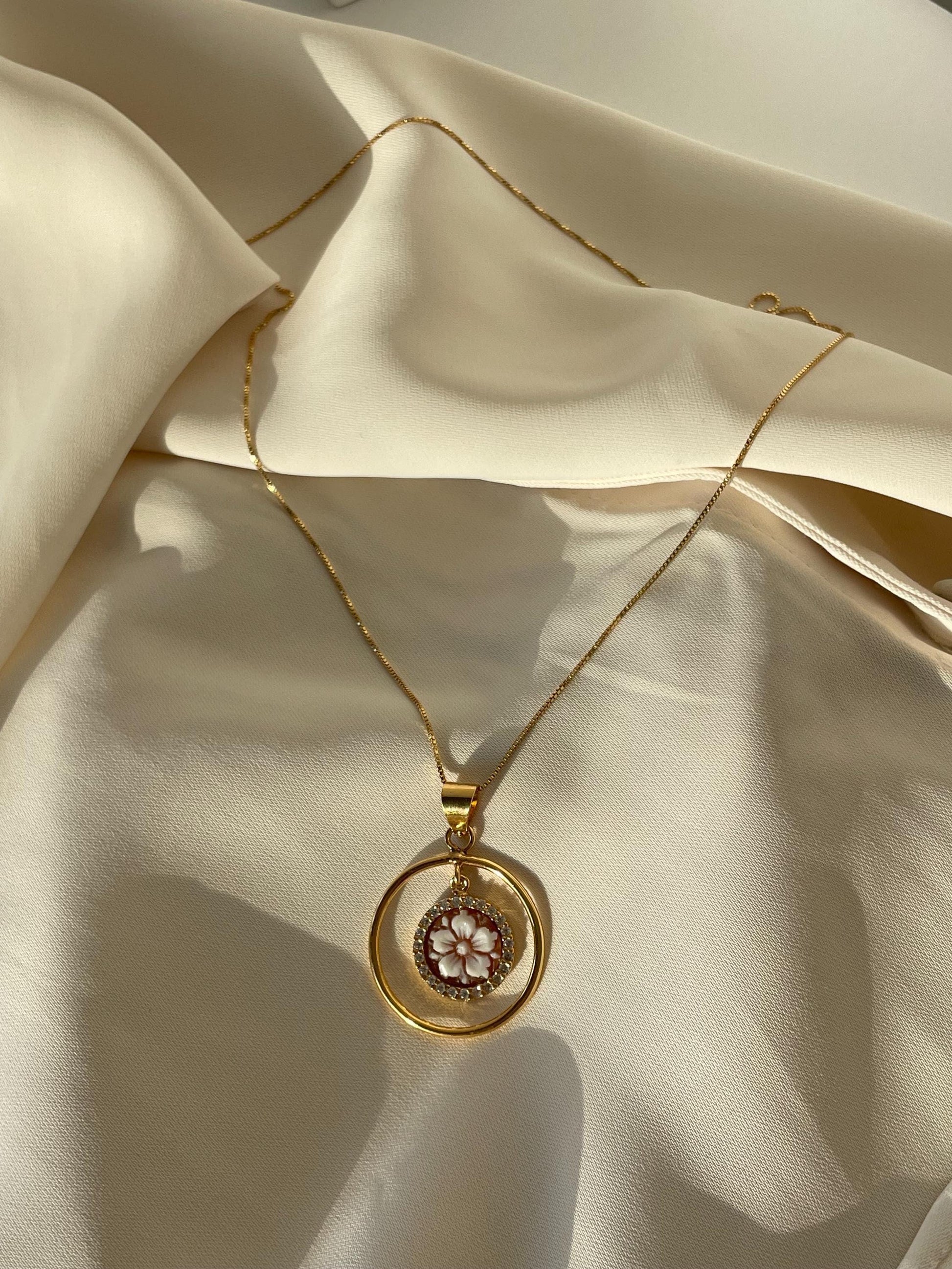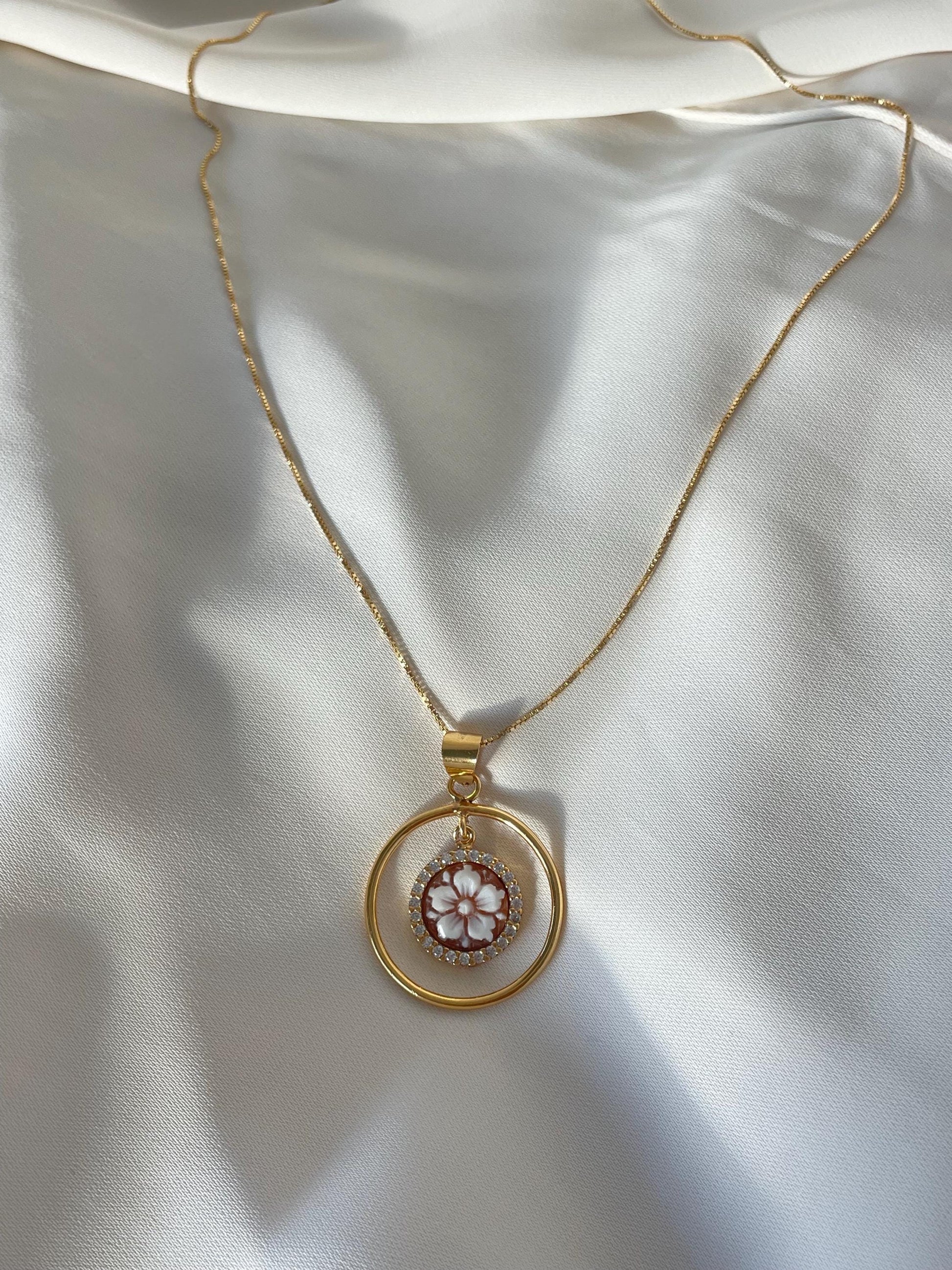 Featuring a handmade floral cameo necklace carved from a sea shell; framed with charming zircons