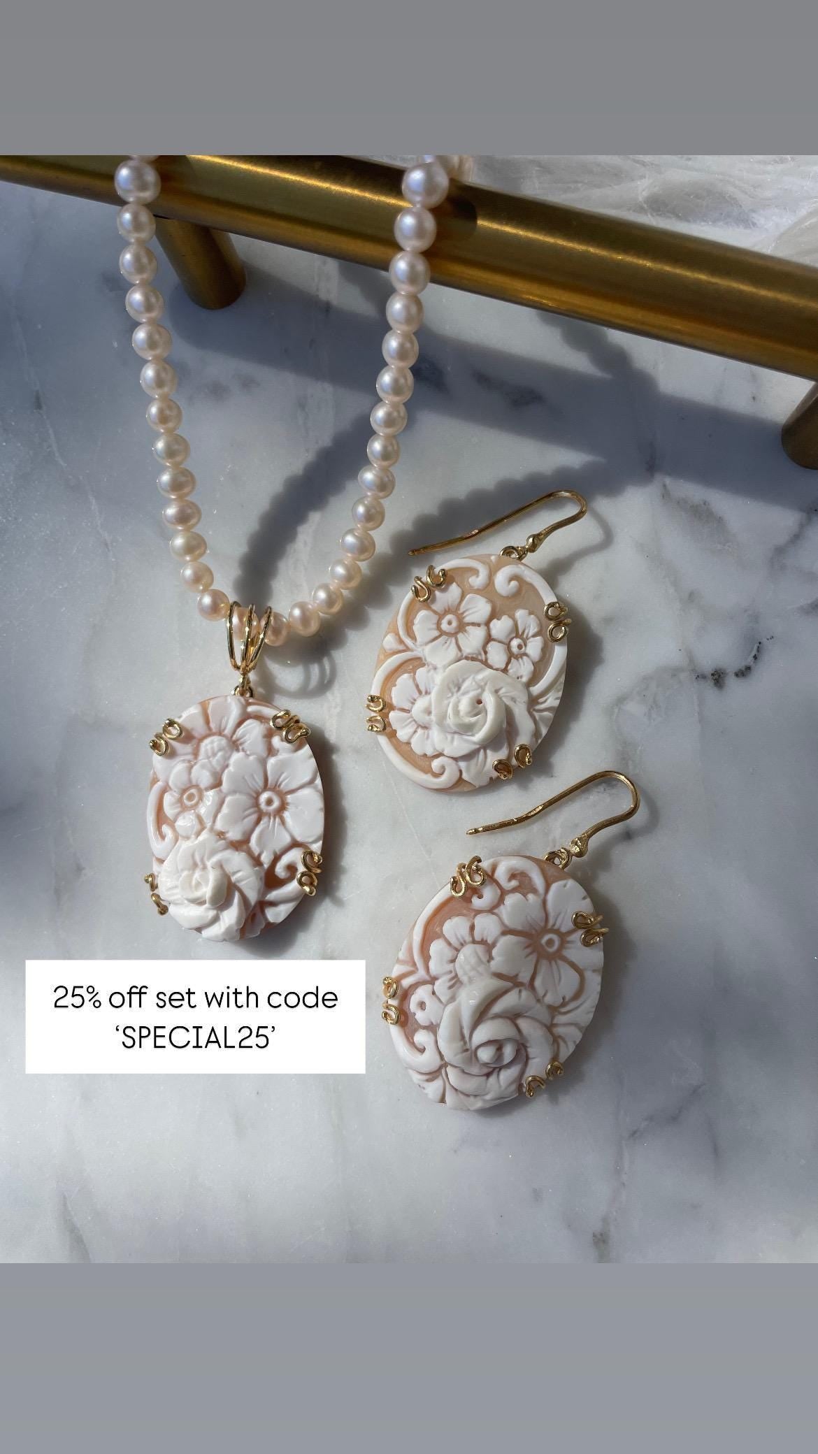 Floral cameo set, freshwater pearls necklace, personalised gift for her, bridal necklace, wedding, genuine Italian cameo, dainty necklace