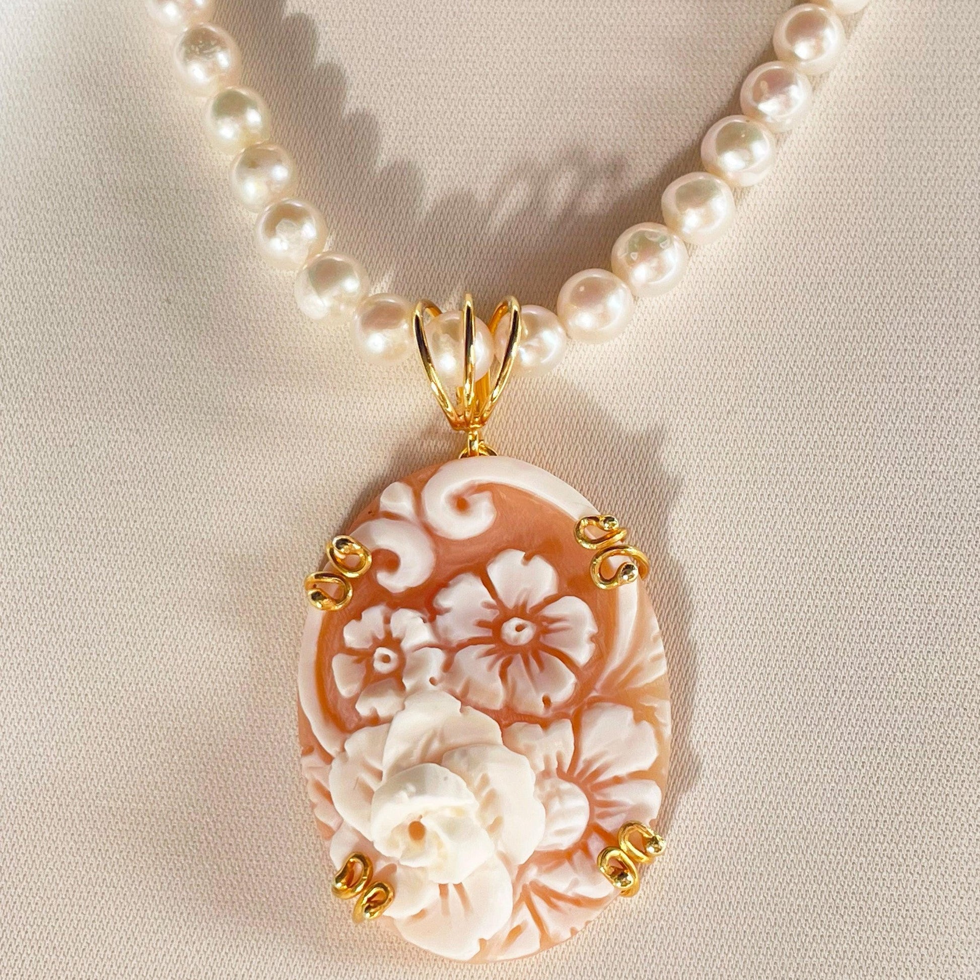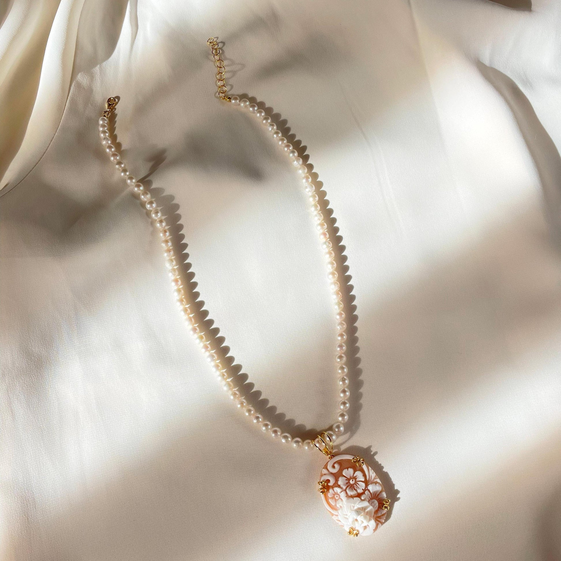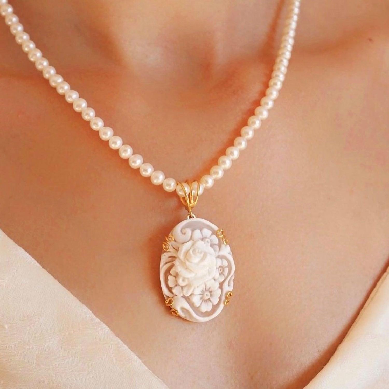 Floral Rose cameo freshwater pearls necklace, personalised gift for her, bridal necklace, wedding, genuine Italian cameo, dainty necklace