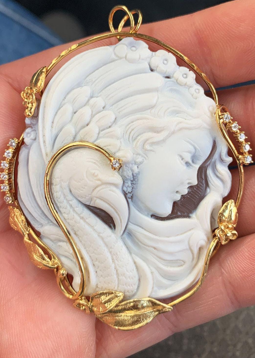 Enjoy a unique, one of a kind cameo carved by hand featuring natures‘ harmony between Flamingo & girl, decorated by a golden silver sterling frame and shiny zirconia