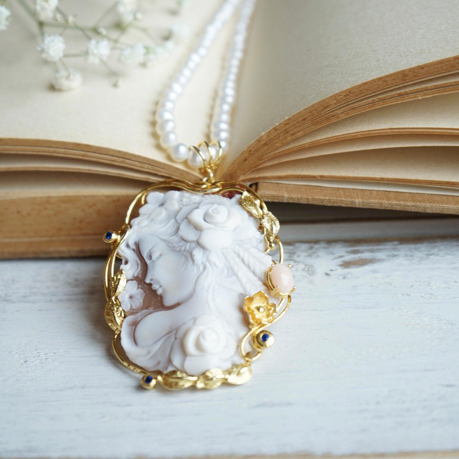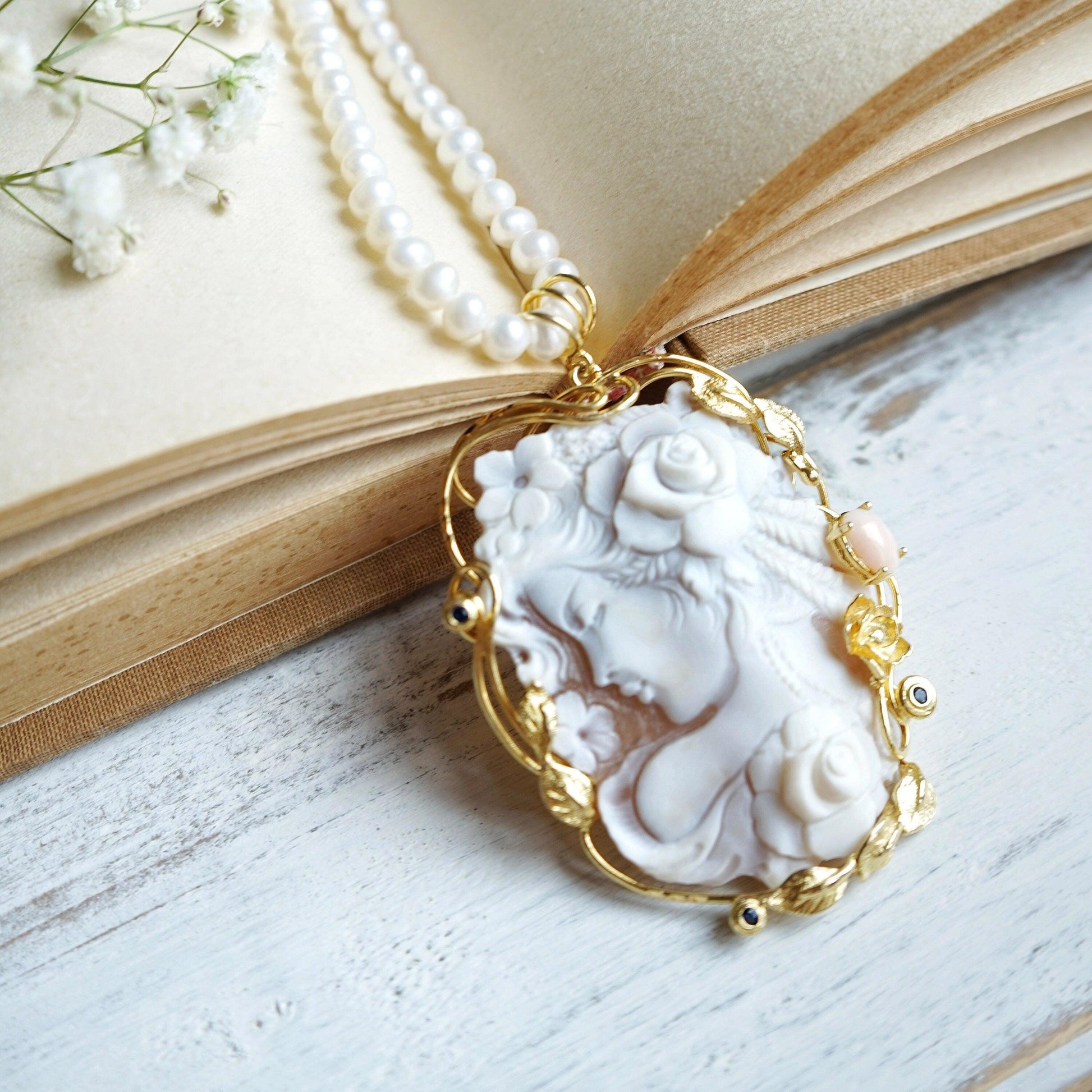 Genuine cameo jewelry necklace, Girl with flowers and pink stone, silver sterling 925, personal gift for her, bridal wedding jewelry, coral