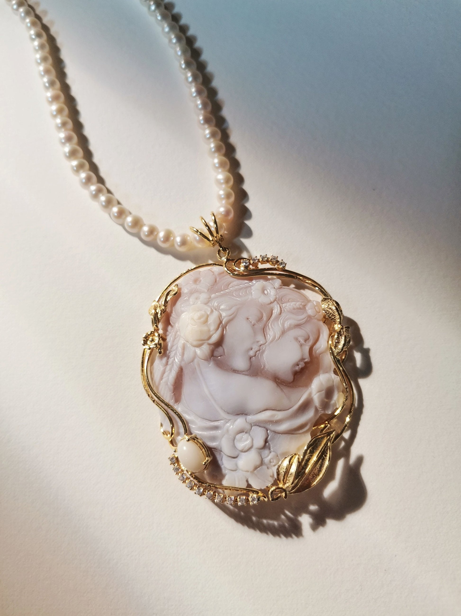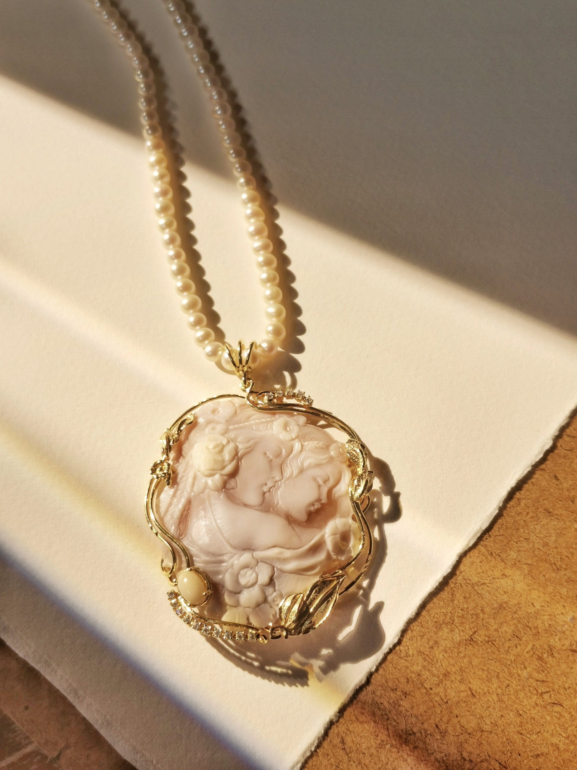 A genuine Italian-made pearl & cameo necklace, carved from medeteranian seashell. Carved by hand.