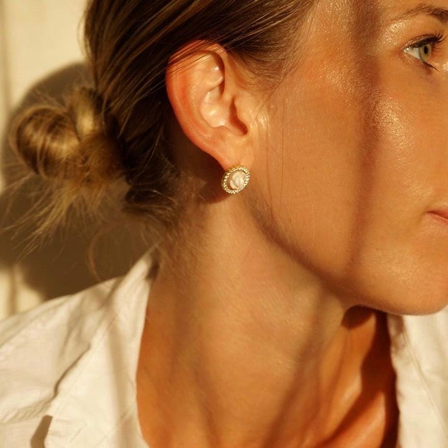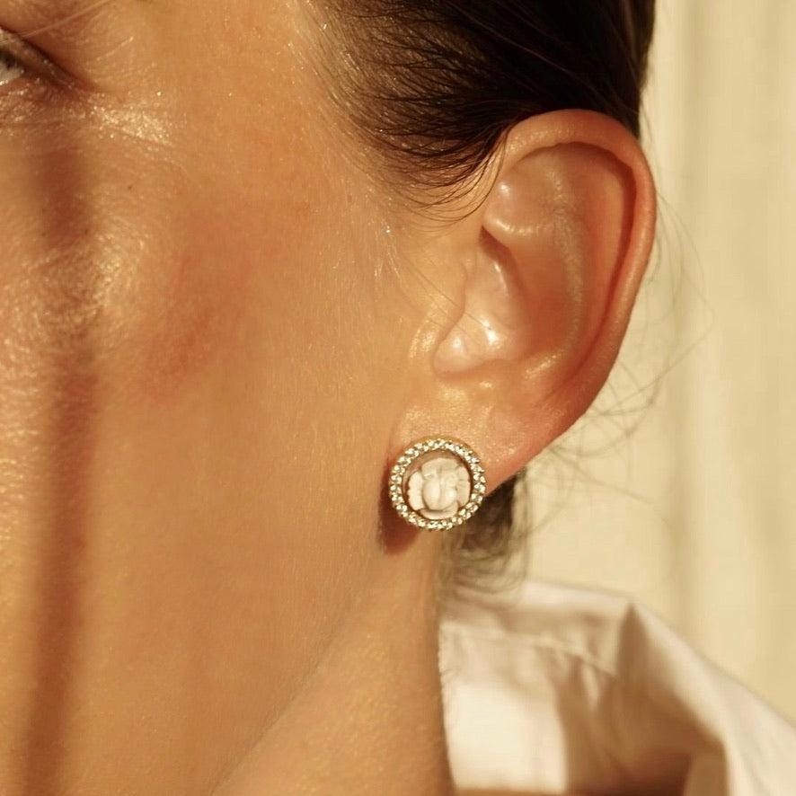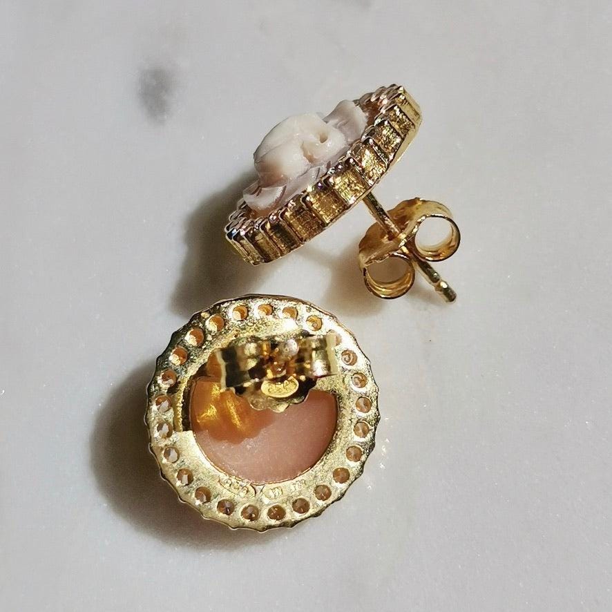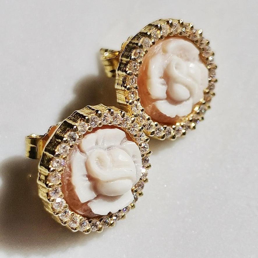 Handmade Cameo 18k gold earrings, anniversary, wedding gift, made in Italy, rose theme, minimalist golden earrings, personalised jewelry set