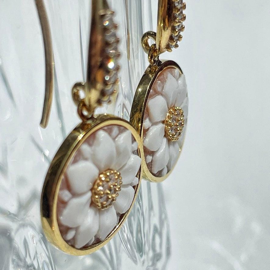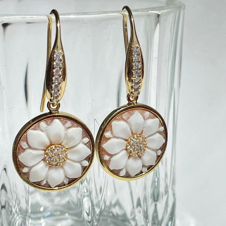 Handmade cameo drop earrings, floral theme, wedding and anniversary gift, gold earrings, made in Italy, custom unique gift, gifts under 100