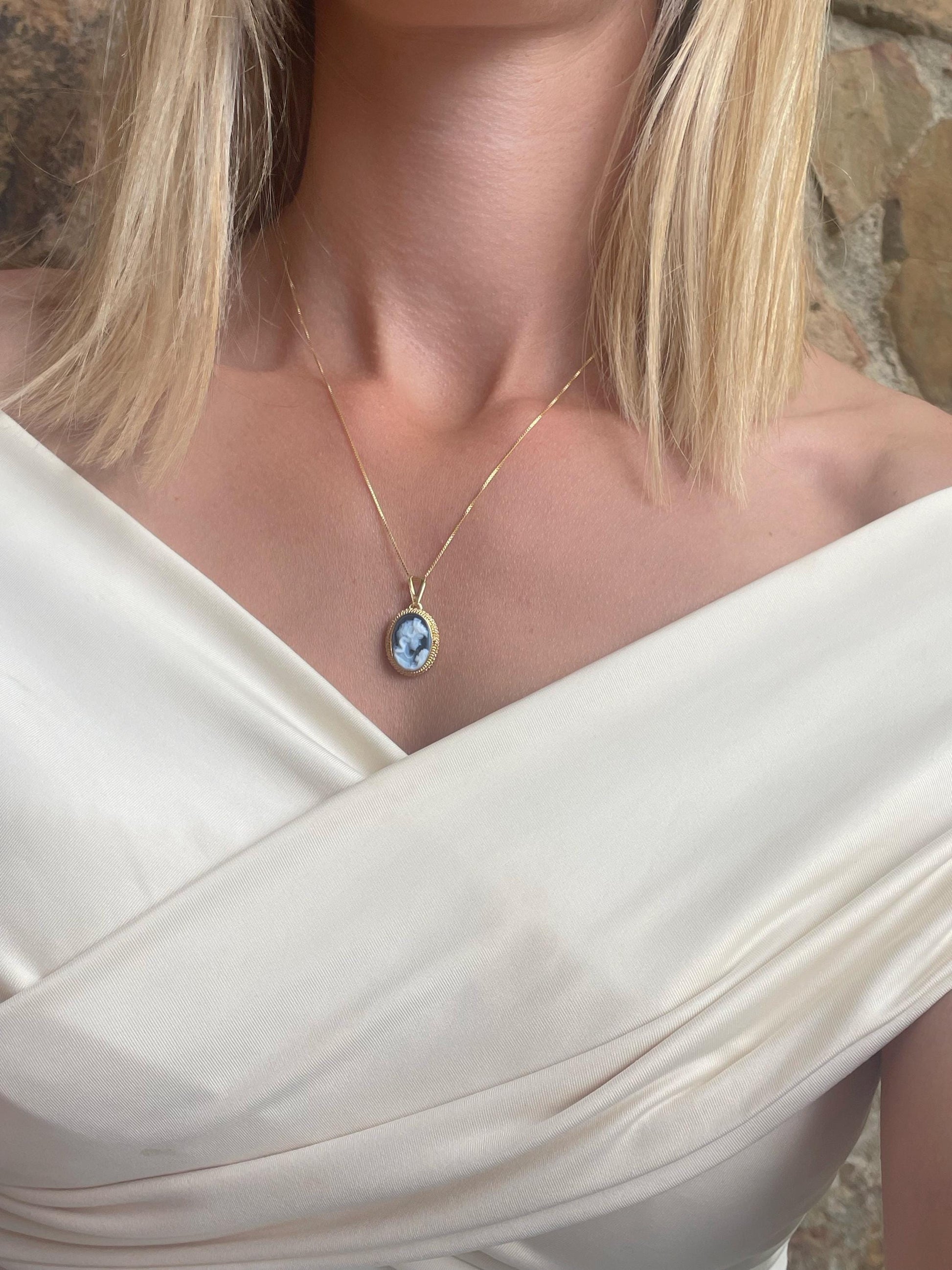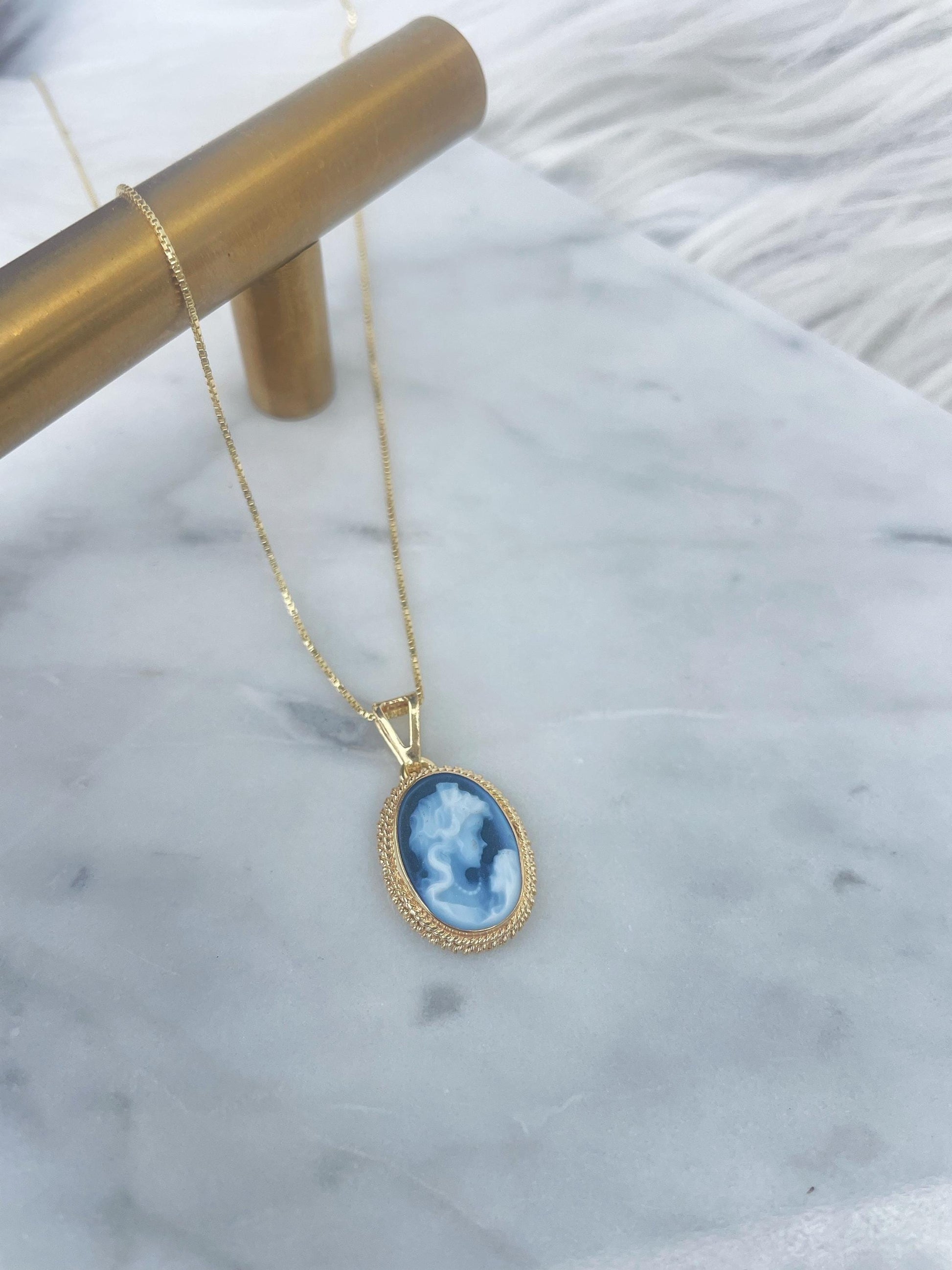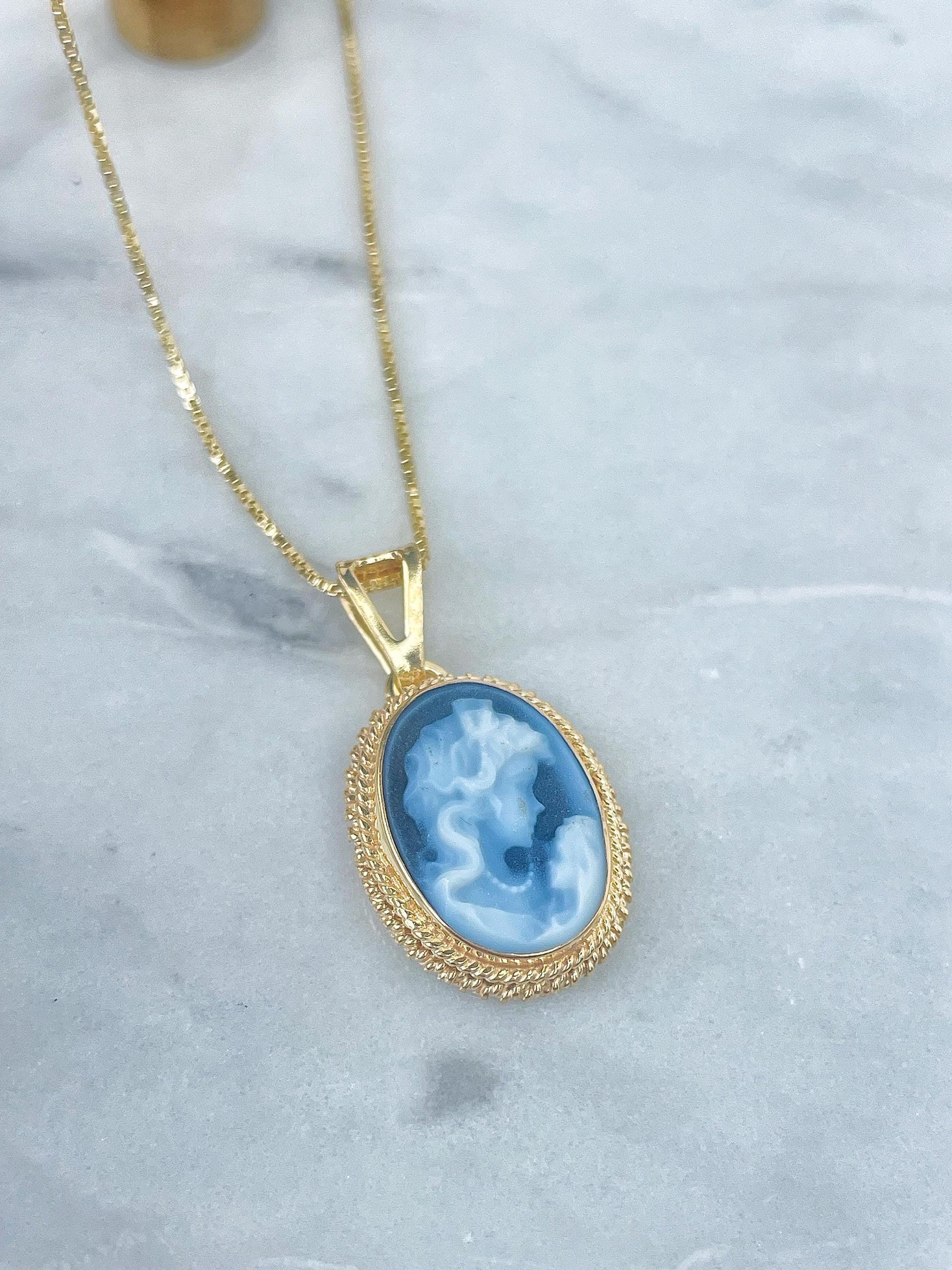 Featuring a blue agate cameo necklace framed with a golden silver sterling 925 textured frame and chain.