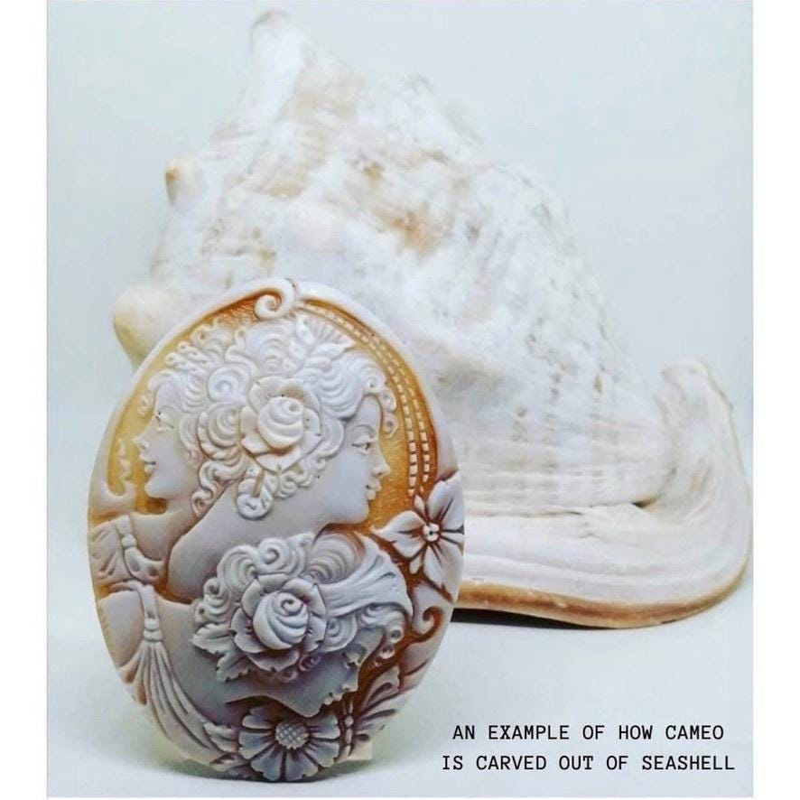 Featuring The Three Graces carved from sea shell; a handmade cameo ring; framed by a beautiful textured silver frame.